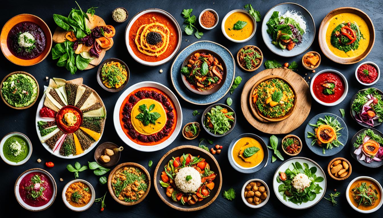 From India’s creamy curries to the Mediterranean’s tasty falafel and hummus, vegan options are endless. By trying these diverse flavors, we can start a culinary journey. It’s a journey that celebrates the vibrant and sustainable future of vegan cuisine around the world.