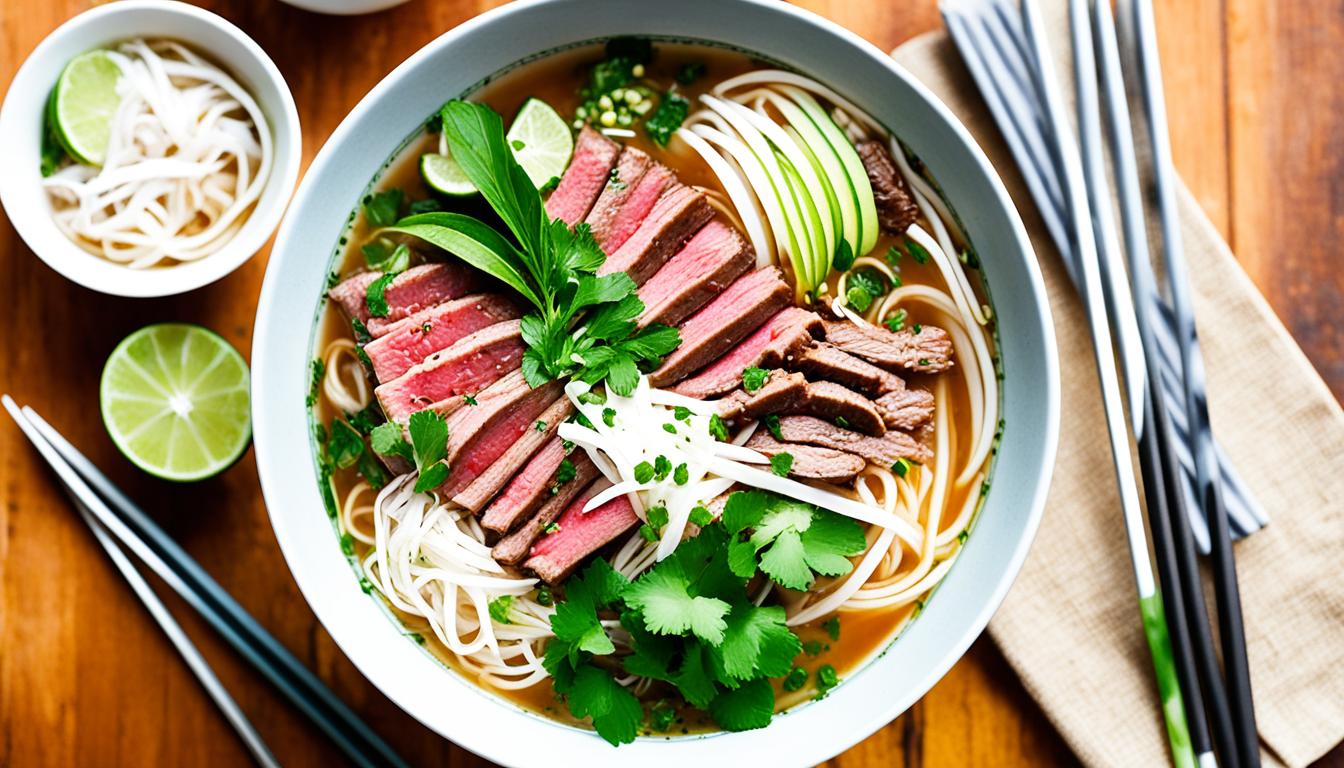 Be careful when arranging these garnishes. Layer them to make your pho look great. Put the herbs on top, letting their colors pop. Place lime wedges and chili-garlic sauce around the edges for guests to add to their meal. With these garnishes, you’ll make your pho dining experience unforgettable.