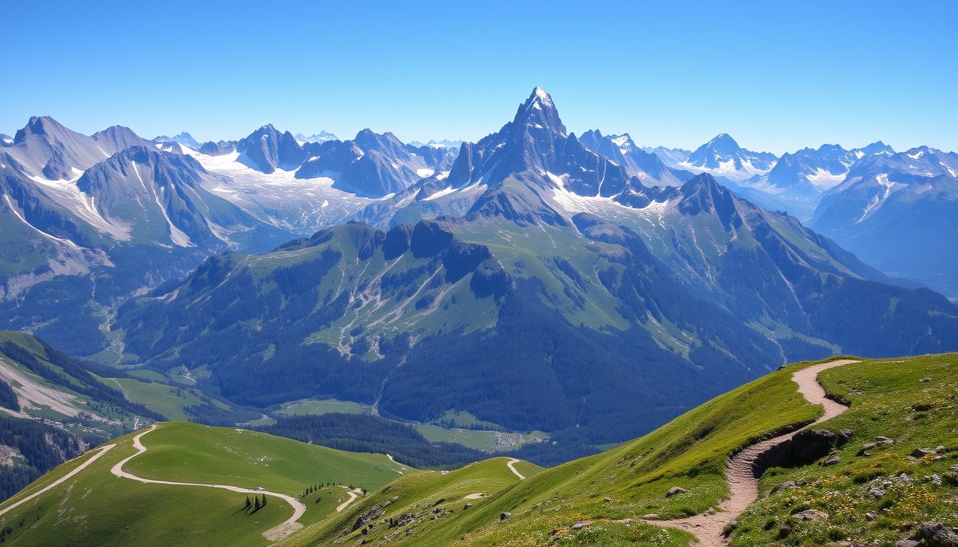 The Swiss Alps are a dream for hikers, with breathtaking landscapes. They feature tall peaks, glacial valleys, and clear lakes. Such beauty is key for both body and mind, stressing the value of outdoor activities.
